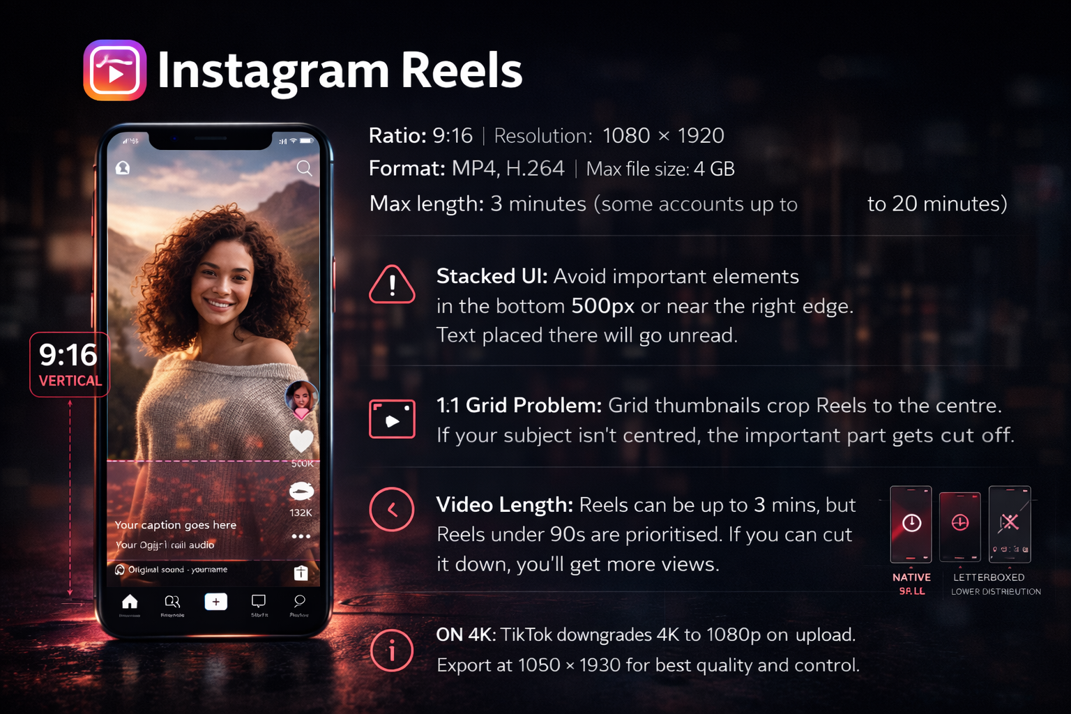 | Instagram Reels | 9:16 | 1080 × 1920 | 3 min (most accounts) | MP4 |