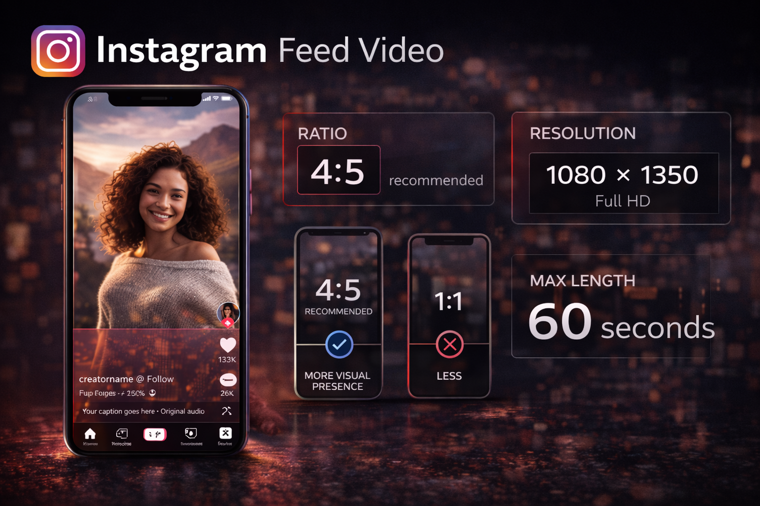 | Instagram Feed | 4:5 | 1080 × 1350 | 60 sec | MP4 |