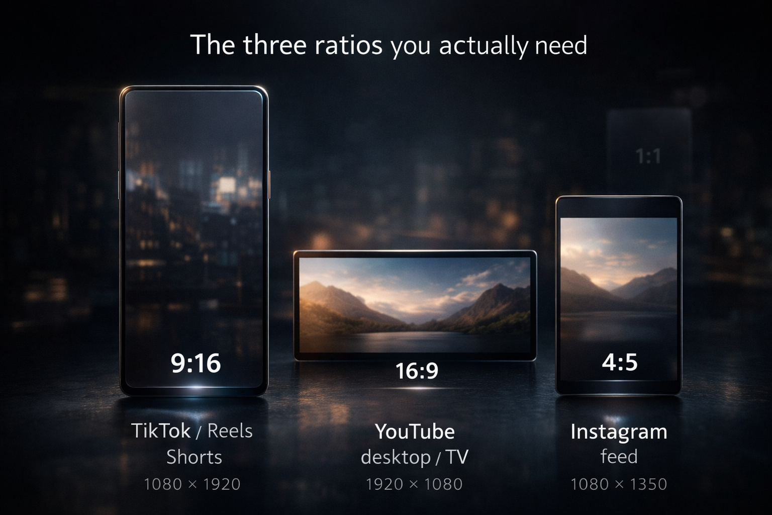 9:16 — vertical, portrait, full-screen mobile. The native format of TikTok, Instagram Reels, YouTube Shorts, and Stories. At 1080 × 1920 pixels it fills a phone screen completely — no letterboxing, no padding. If you're making short-form content, 9:16 is the format you work in and everything else is a deviation with a cost.