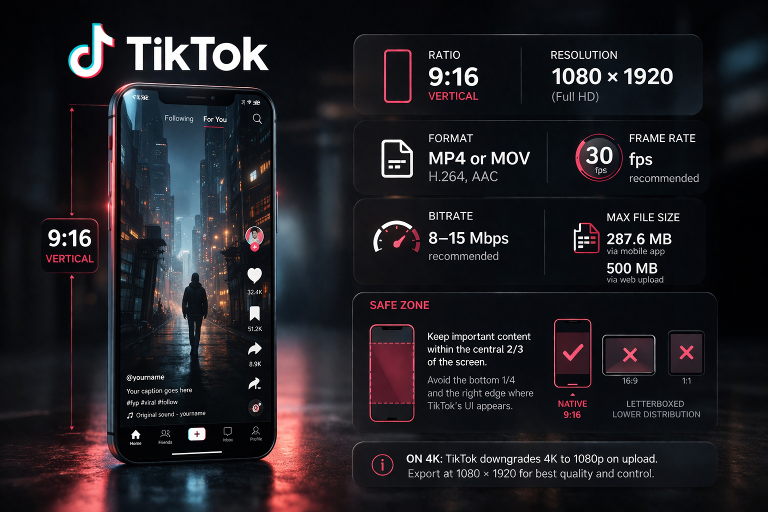| TikTok | 9:16 | 1080 × 1920 | 60 min (upload) | MP4/MOV |
