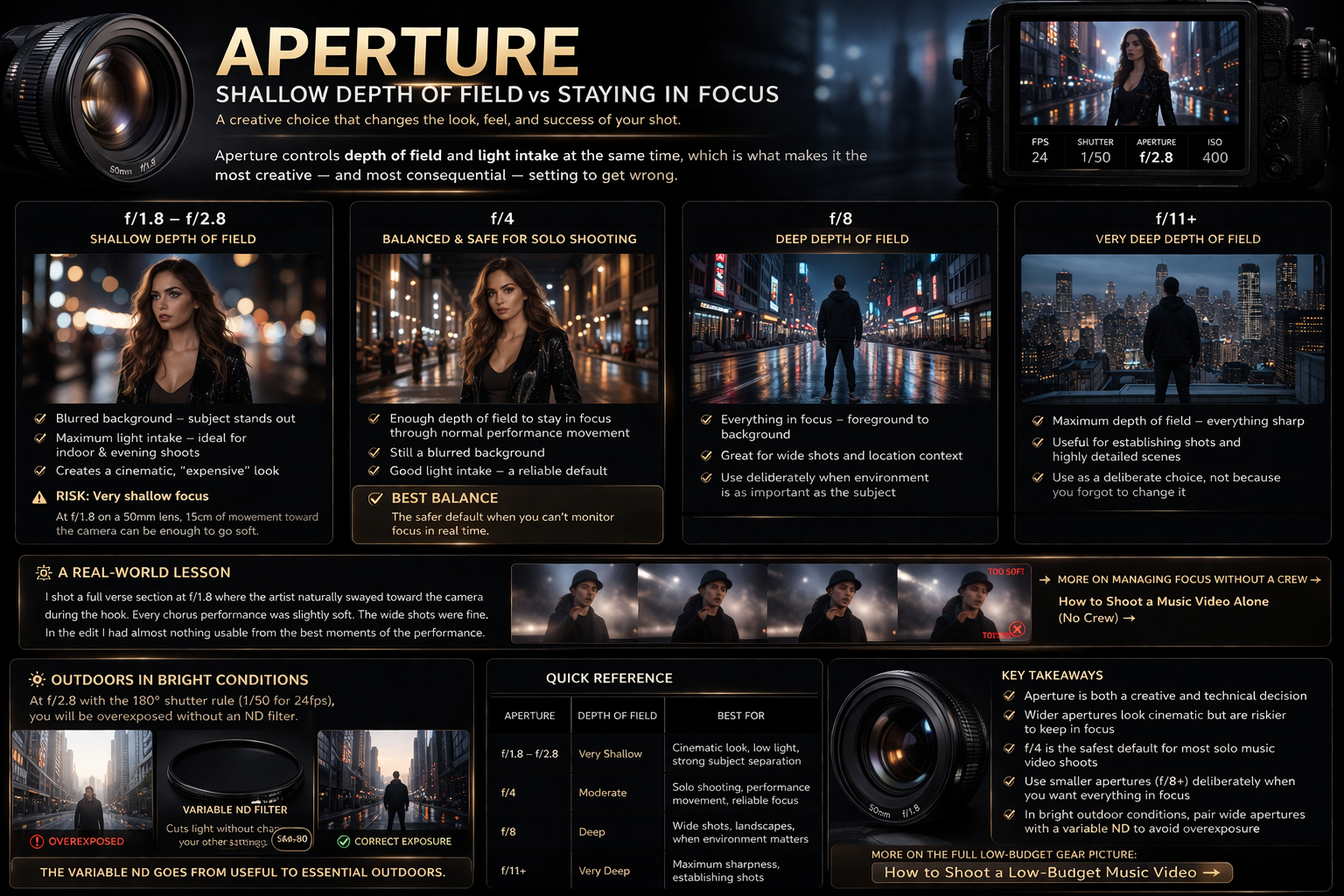 f/4 is the balance point for solo shooting — enough depth of field to stay in focus through normal performance movement, still a blurred background, still letting in decent light. It's the safer default when you can't monitor focus in real time. More on managing focus without a crew in How to Shoot a Music Video Alone (No Crew) →