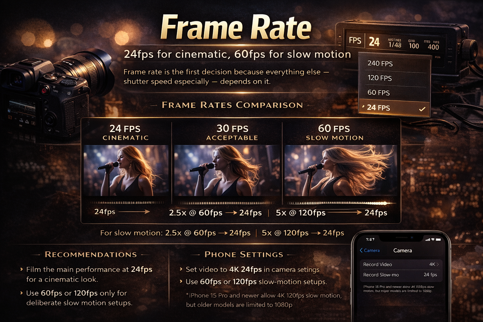 The mistake is shooting the entire video at 60fps because it looks smooth in preview. It doesn't look cinematic in the final edit. Set your main performance shooting to 24fps. Shoot 60fps or 120fps as deliberate slow-motion setups, not as your default.
