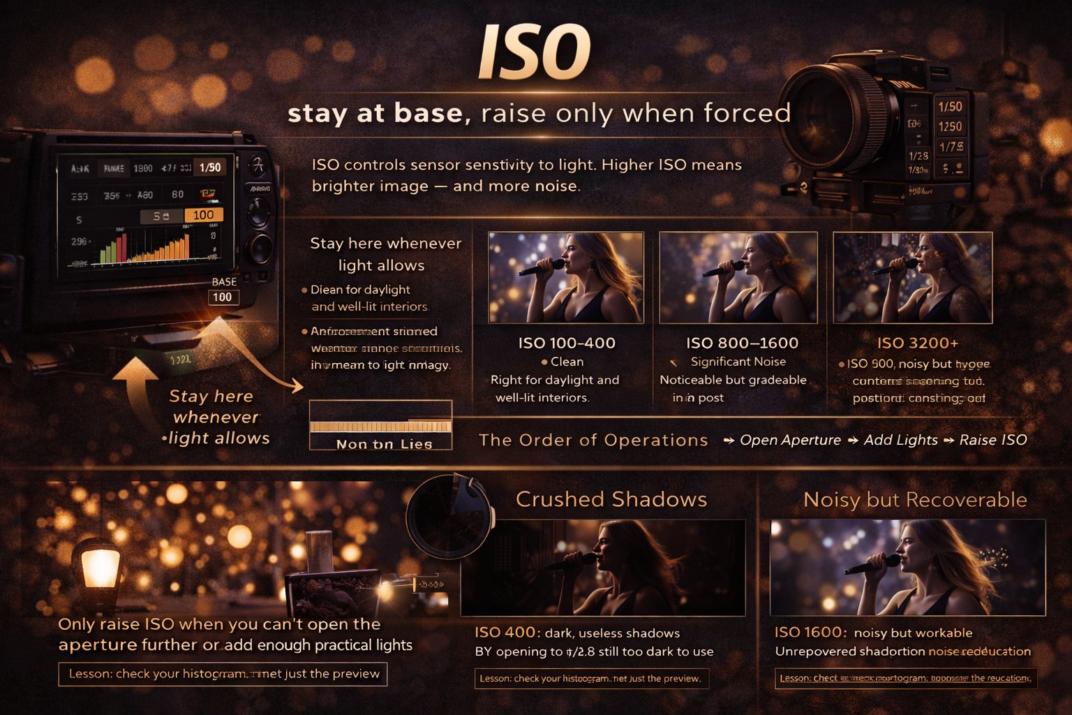 The last time I got this wrong was shooting an interior performance in a room with one practical bulb. I kept ISO at 400 thinking it looked "acceptable" in preview, then found in the edit that the shadows were completely crushed and the grade had nothing to work with. Shooting at ISO 1600 with the same scene would have given me a noisy but recoverable image. Lesson: check your histogram, not just the preview.