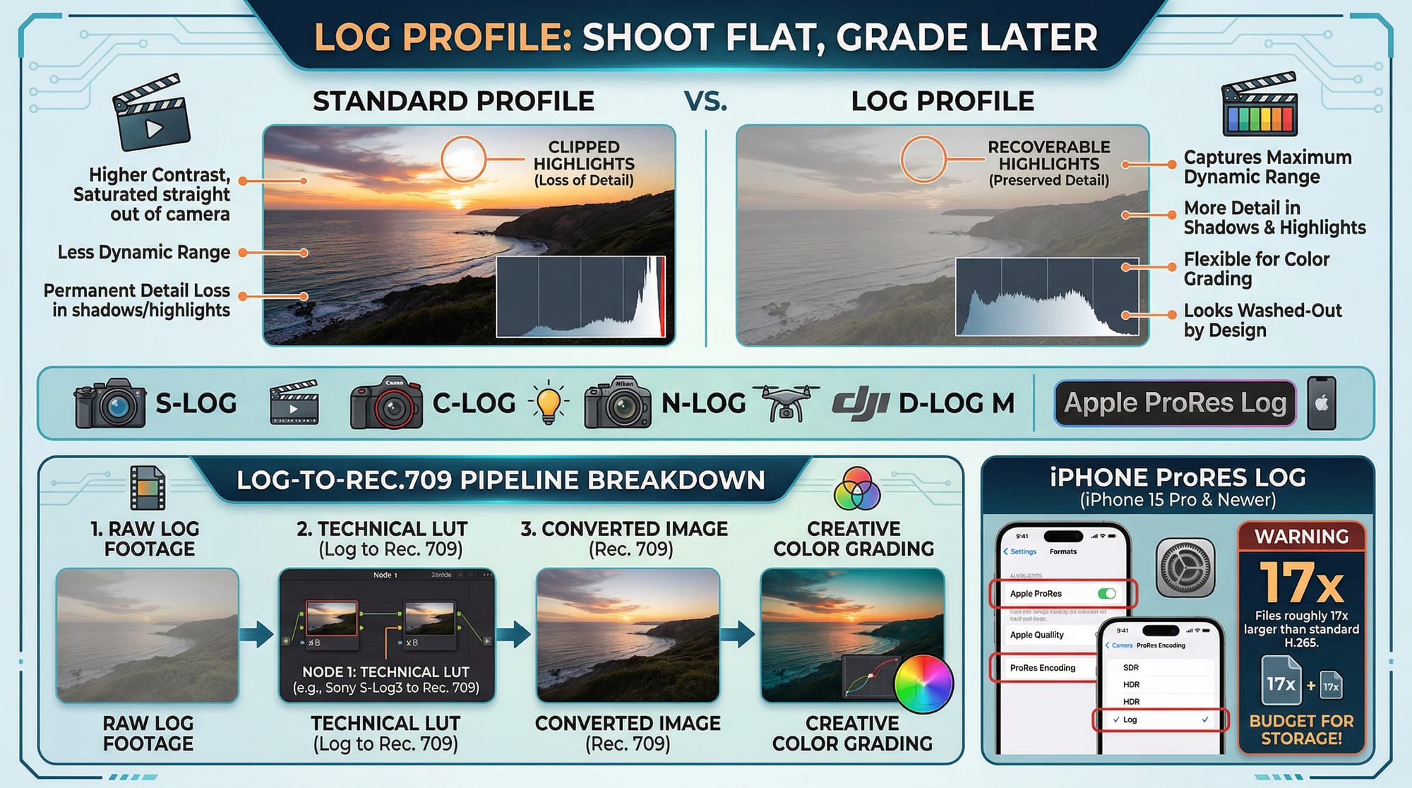 For phone shooting: iPhone ProRes Log is the closest equivalent — enable ProRes in Settings → Camera → Formats, then select Log encoding. Available on iPhone 15 Pro and newer. Files are roughly 17x larger than standard H.265, so budget for storage. For a project you're grading seriously the flexibility is worth it. For casual social content, standard 4K is usually sufficient. I shot a full music video on iPhone 15 Pro in Apple Log last year and the grade held up better than footage I'd previously shot on a mid-range mirrorless in a standard profile — the dynamic range difference was visible.