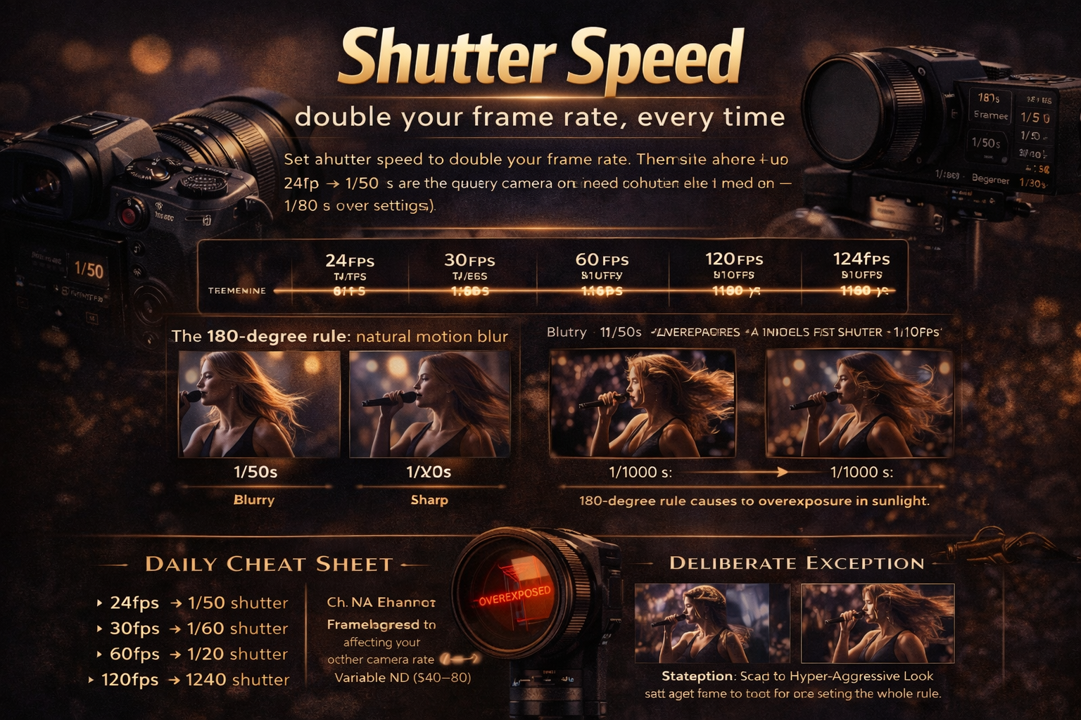 This ratio — the 180-degree rule — produces the natural motion blur that makes video look like video rather than a sequence of still photos. It's the single setting most beginners get wrong, and it's the reason footage shot at the right frame rate can still look wrong.