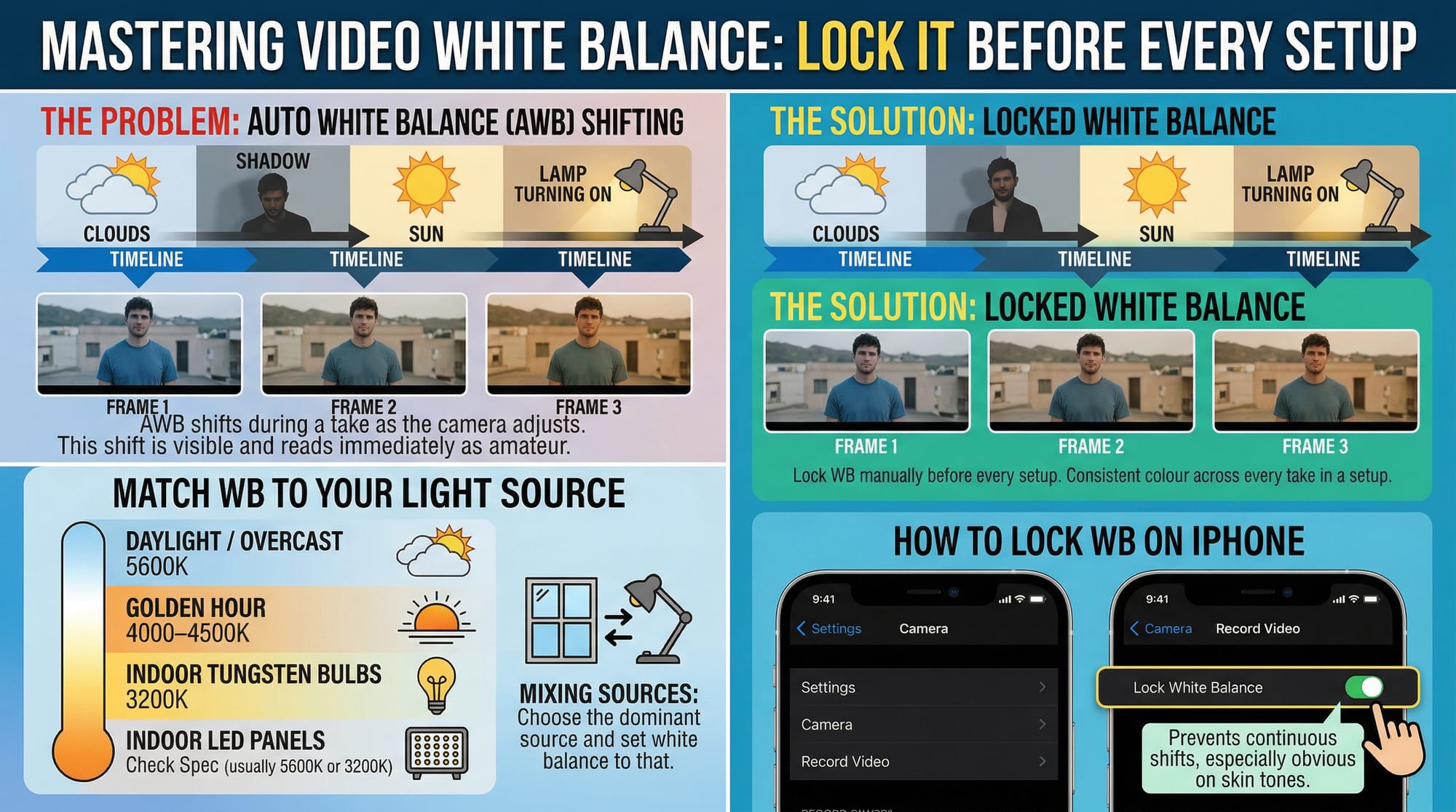 Mixing sources — natural window light plus a practical lamp — choose the dominant source and set white balance to that. In post you can nudge it, but locked white balance gives you consistent colour across every take in a setup. On iPhone: Settings → Camera → Record Video → Lock White Balance. Without this, the iPhone adjusts white balance continuously during recording, and the shift is especially obvious on skin tones.