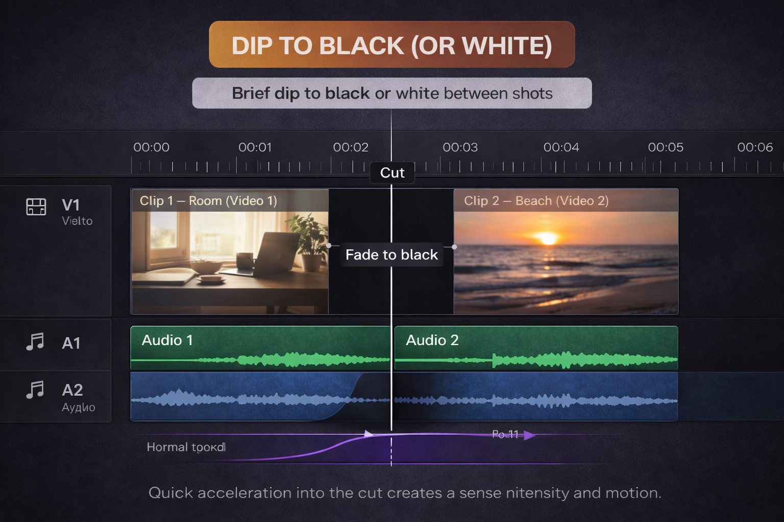 A dip to black feels like a breath. A blink. It's used between major sections of a song to create a sense of time passing or mood shifting. In slower, more emotional music it reads as the editor stepping back and letting the cut breathe.