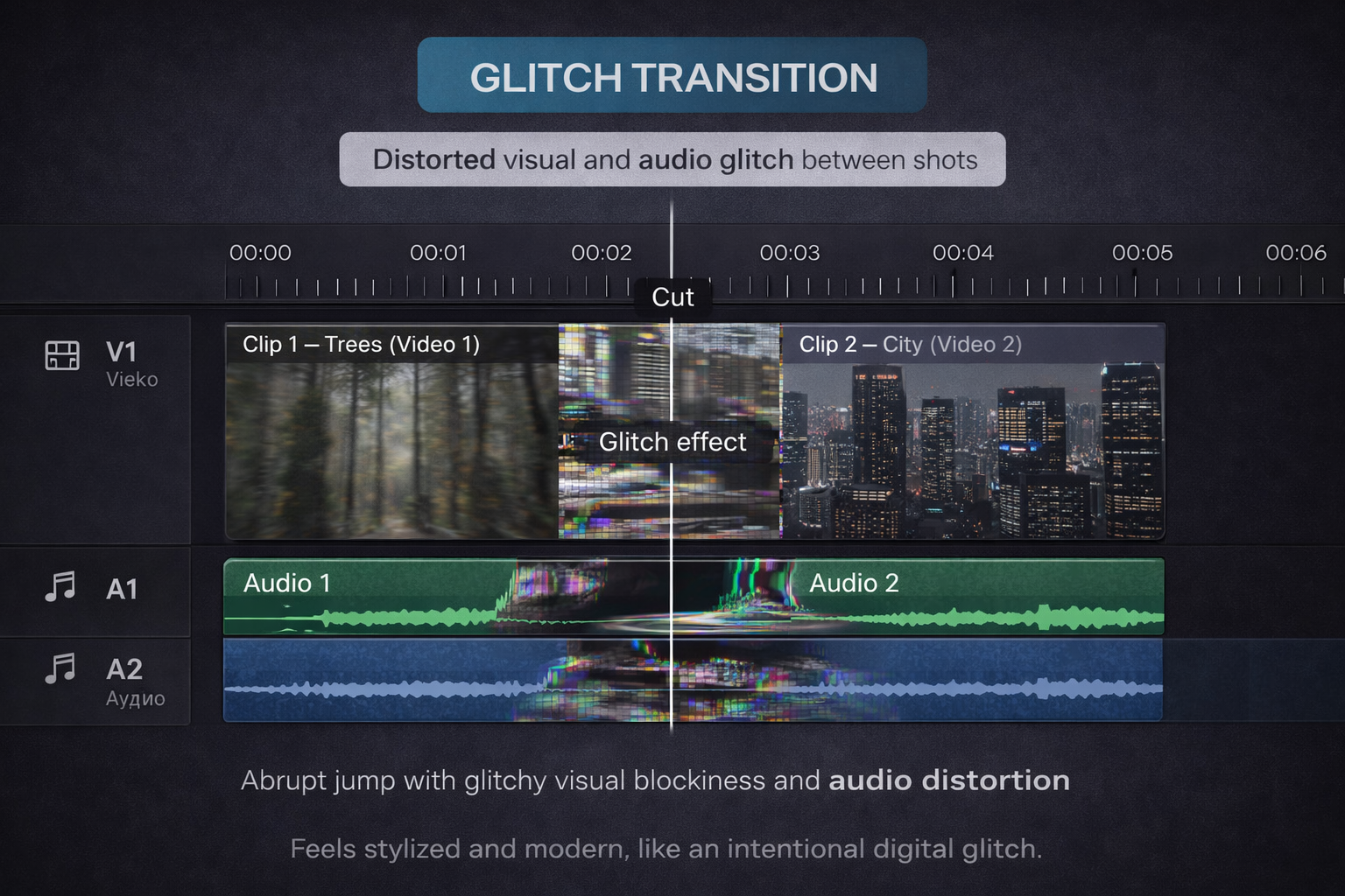 In electronic music, hip-hop, and experimental genres, this works because the aesthetic aligns with the music's production style. Glitch edits look like what digital music sounds like. The transition isn't fighting the genre — it's speaking its language.
