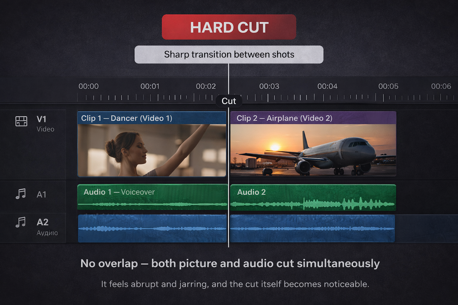 A hard cut is nothing. Clip ends, next clip begins. No overlap, no movement, no blur — just a clean edit point. It's the most common transition in professional music video editing by a large margin, and the one beginners use least because it feels like you're not doing anything.