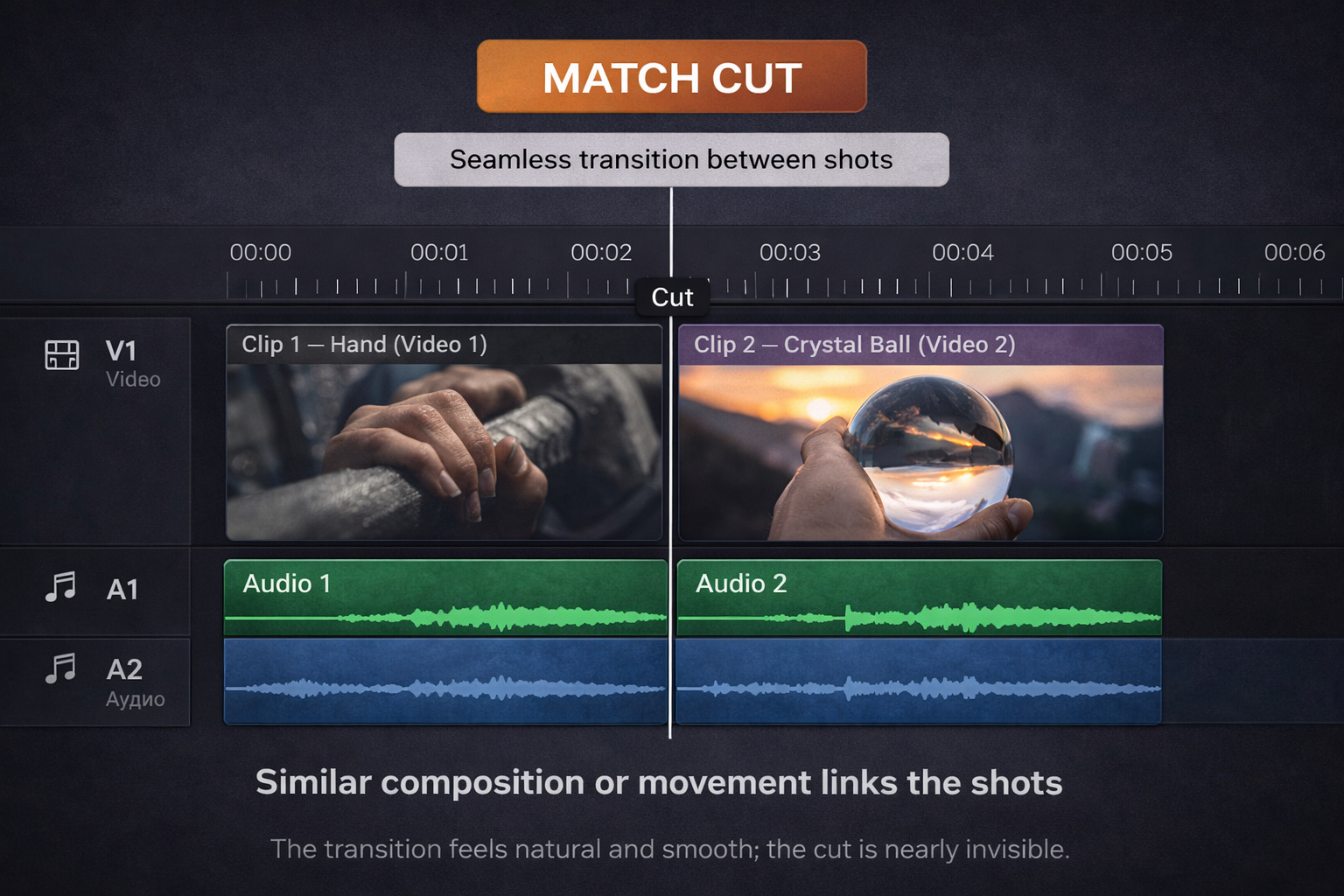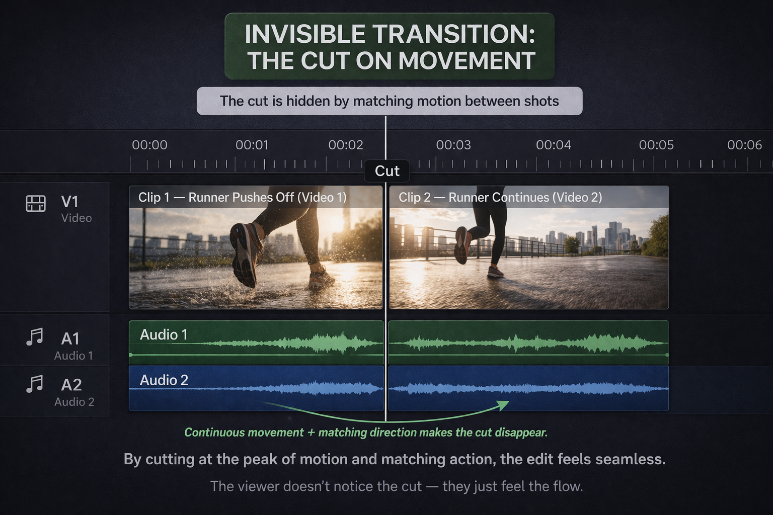 The outgoing clip has movement in it — a turn, a walk, a hand gesture — and you cut in the middle of that movement to a different clip where the movement completes or continues. Because the eye is tracking the motion, it doesn't register the edit. The brain fills in the gap and reads it as one continuous action.