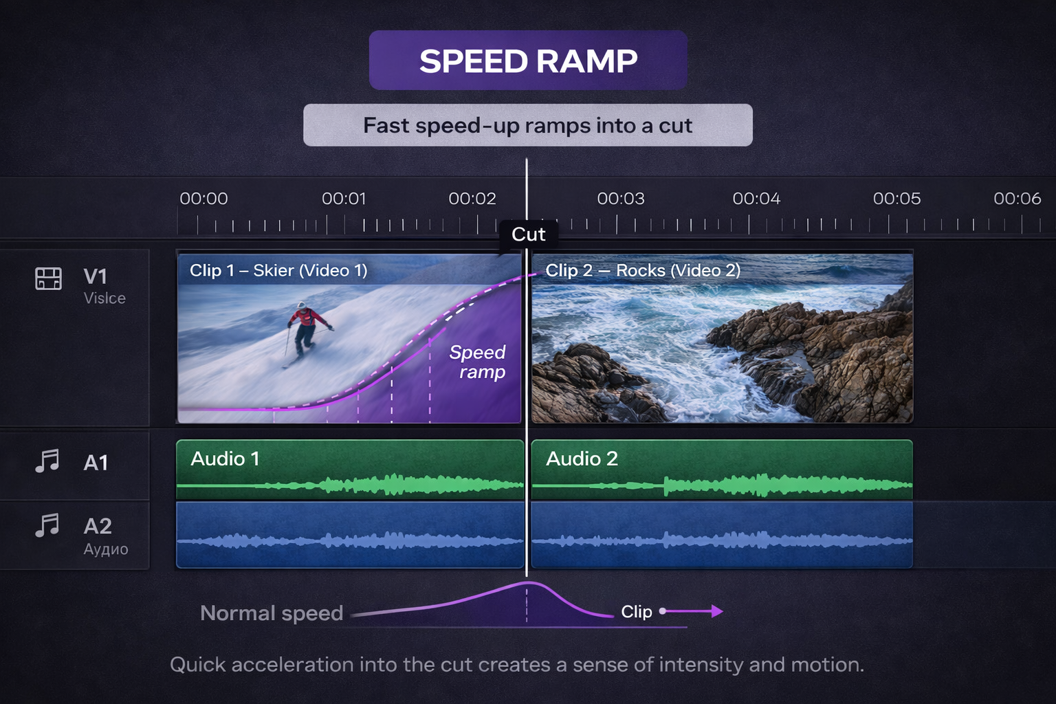 The slow-down creates anticipation. The snap and cut release it. The whole thing happens in one or two seconds but it changes the weight of the edit completely.
