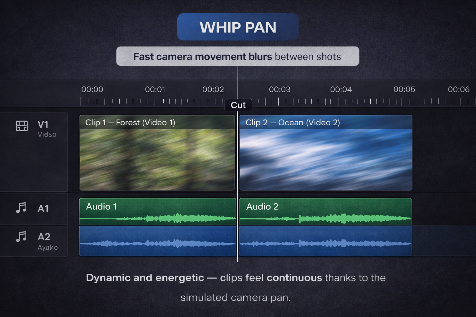 The camera pans hard in one direction, blurs, and the next shot starts with a matching blur that resolves into a new scene. The two blurs are edited together to look like one continuous movement.