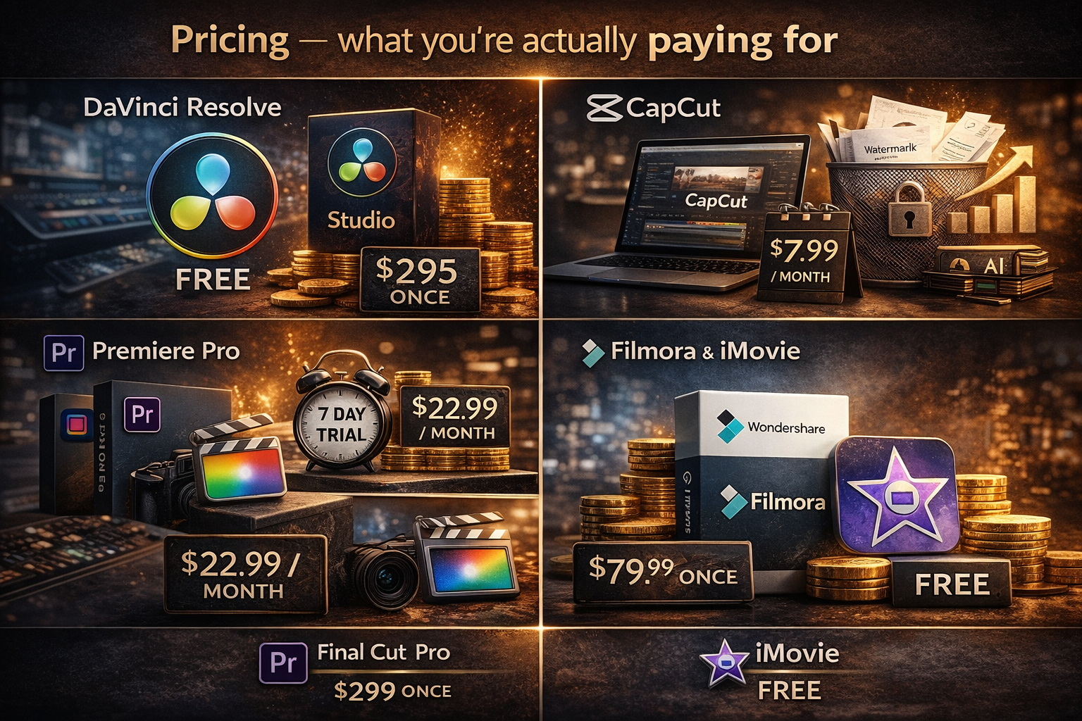 Download DaVinci Resolve free and spend two weeks with it. The free version is more capable than most paid editors. If it's too much for what you're making, CapCut handles short-form faster. If you hit Resolve's ceiling — which most independent editors don't — the Studio upgrade is $295 once.