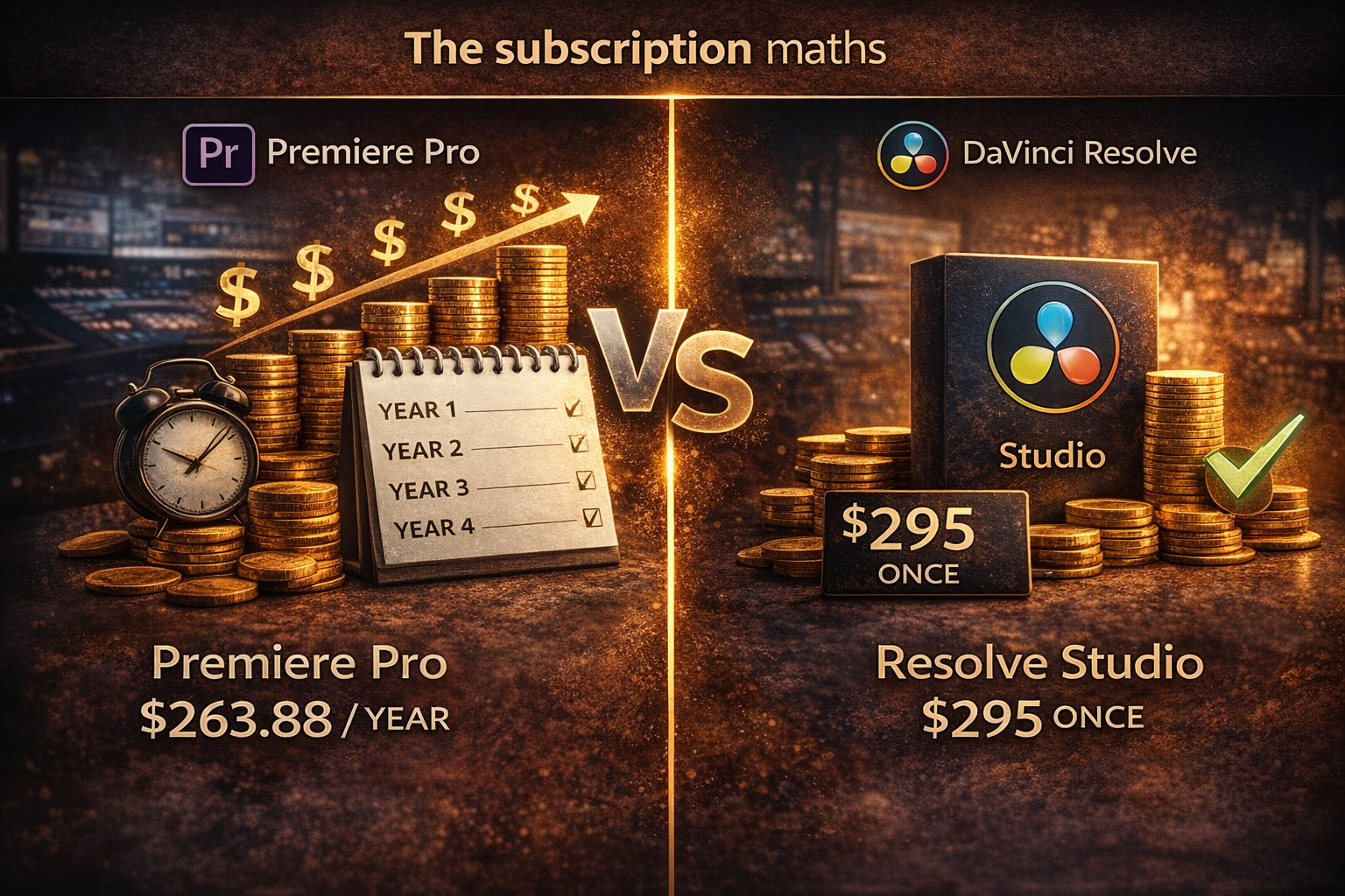 One editor described cancelling all his Adobe subscriptions: "About midway through the second year of using Resolve Studio, I will have already gotten my money's worth compared to what I was paying for Premiere Pro." The maths is straightforward — $263.88/year for Premiere vs $295 once for Resolve Studio.
