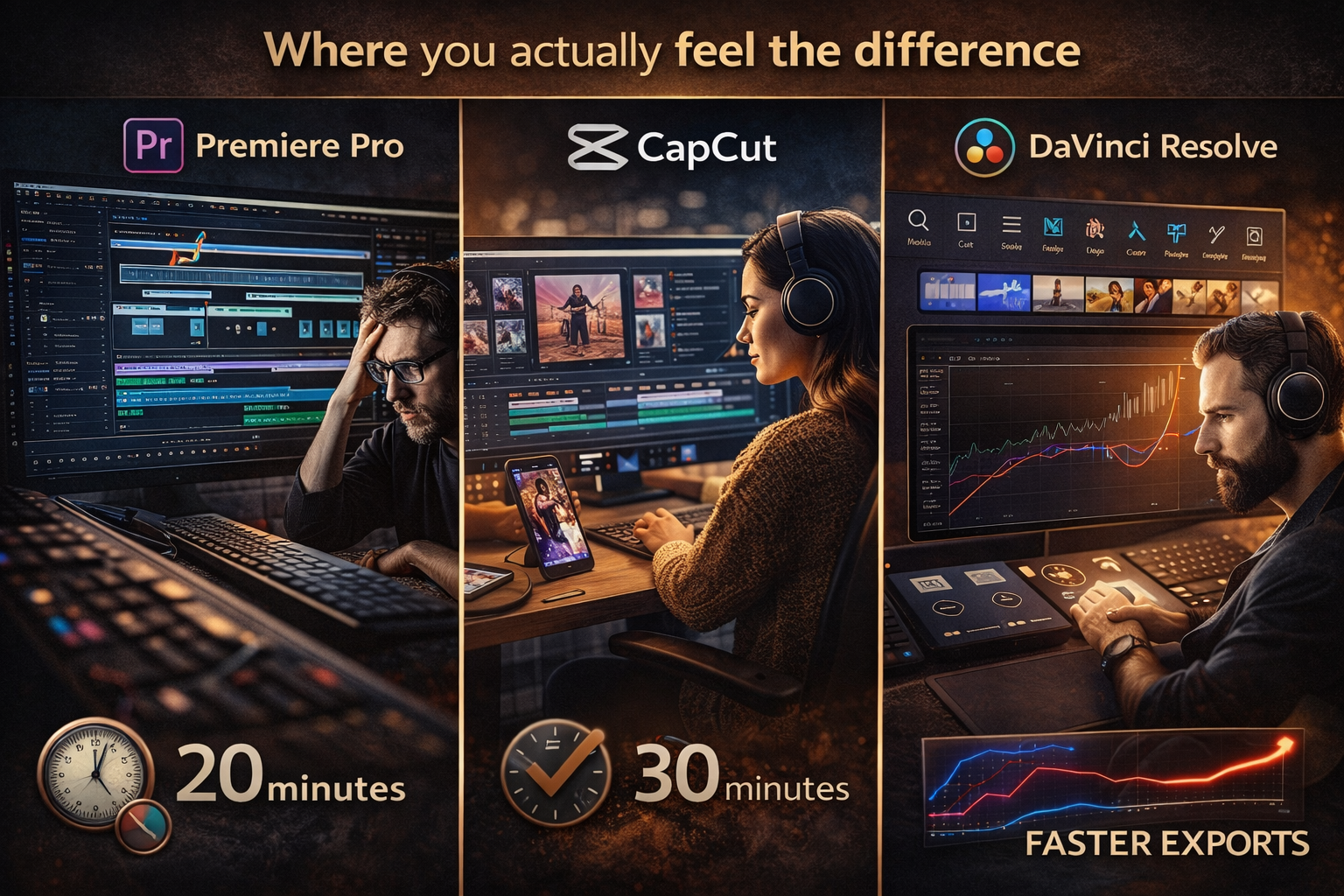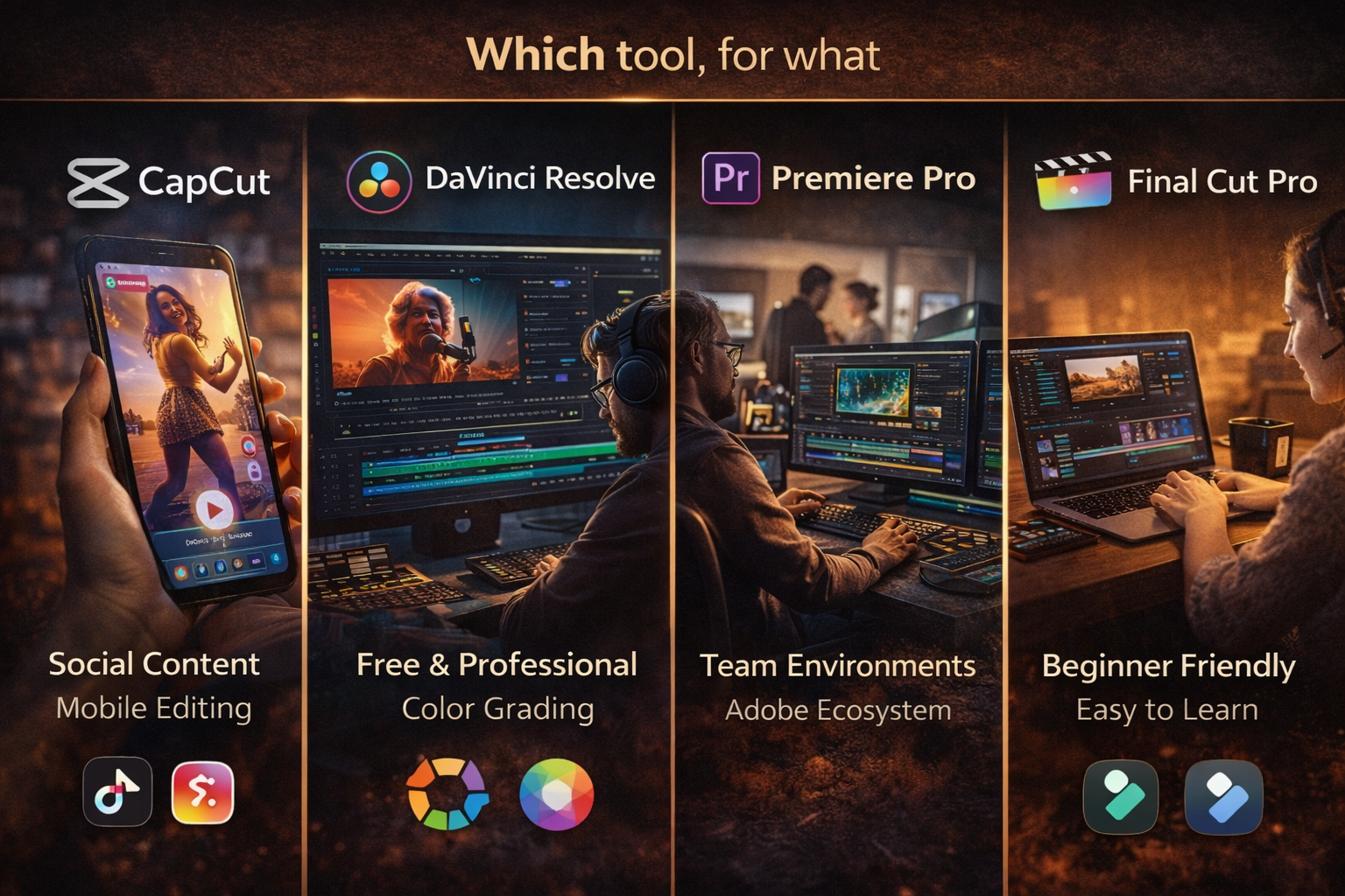 What doesn't make sense: paying for Premiere to edit casual social content that CapCut or Resolve free handles. What also doesn't make sense: opening DaVinci Resolve to edit fifteen-second Reels when CapCut's template workflow gets there faster. Match the tool to the output.