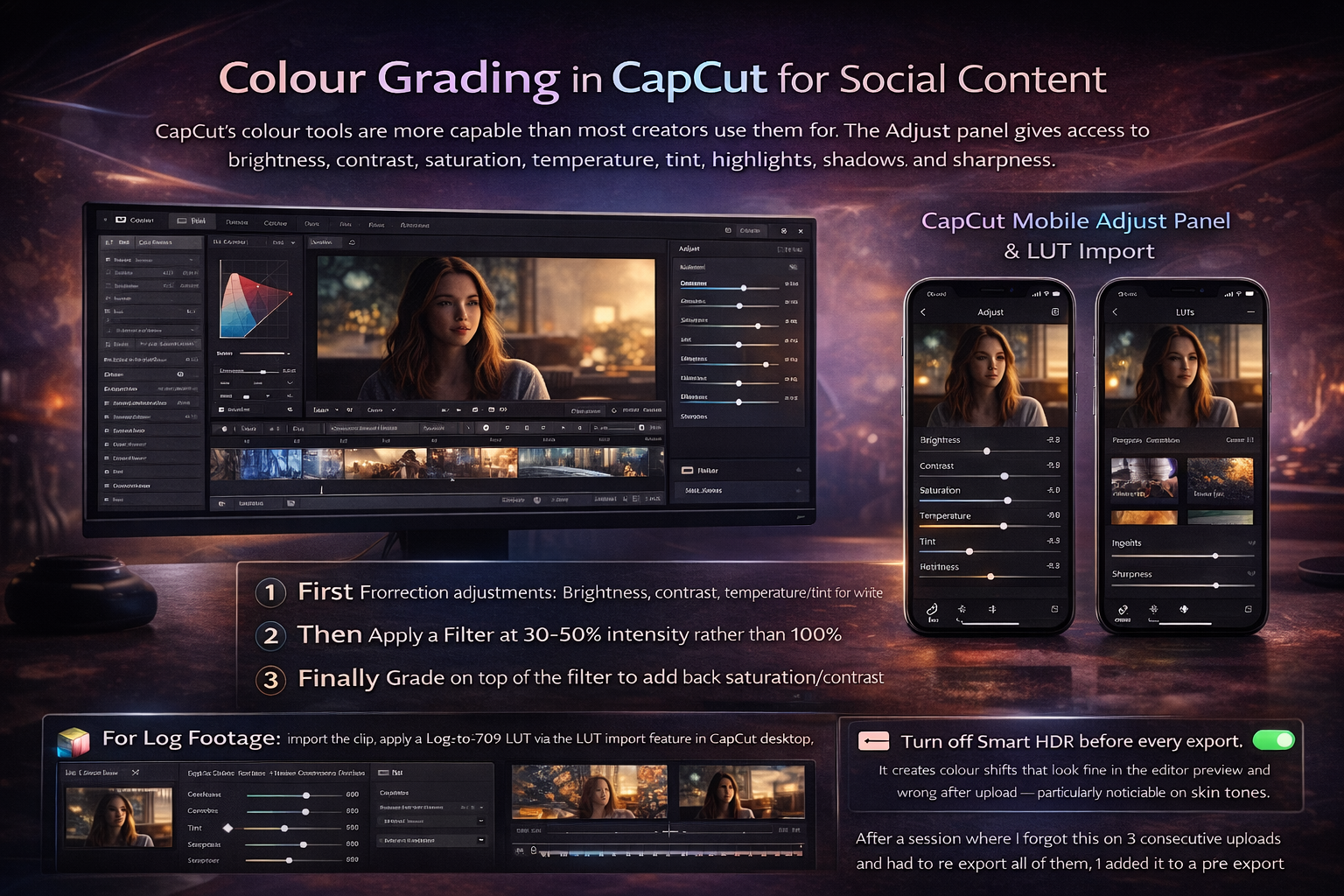 In CapCut: it defaults to Rec. 709 SDR. If you've imported Log footage and applied a filter without first converting Log to Rec. 709 via a LUT, your grade is sitting on flat footage and the result will look wrong after export.