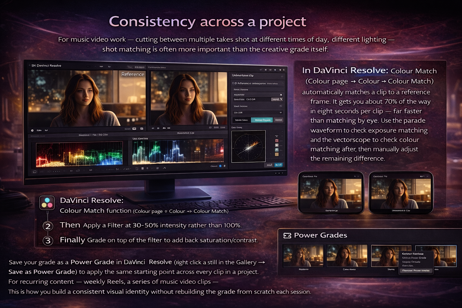 For music video work — cutting between multiple takes shot at different times of day, different lighting — shot matching is often more important than the creative grade itself. A technically correct grade that's inconsistent across shots is more distracting than a moody grade that's perfectly matched.