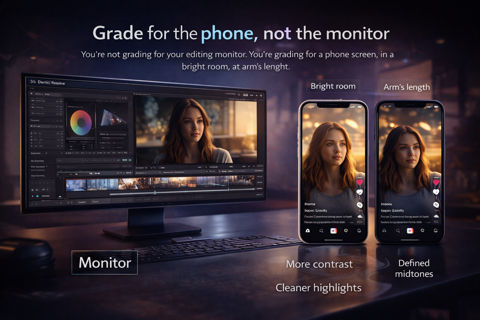 You're not grading for your editing monitor. You're grading for a phone screen, in a bright room, at arm's length. These are not the same viewing conditions.