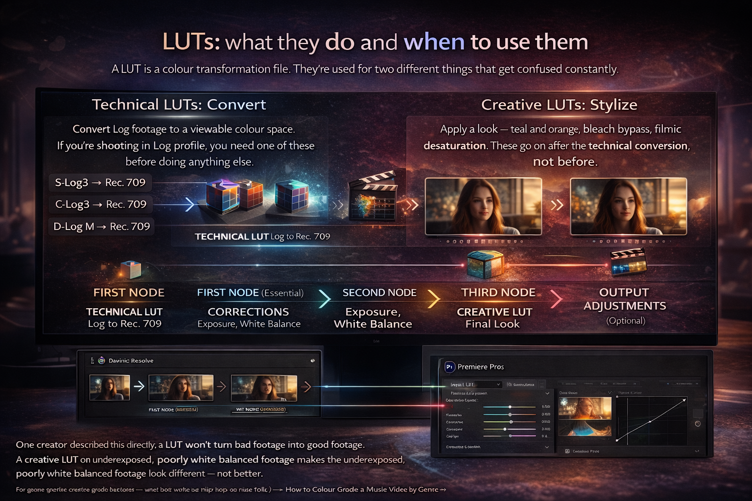 One creator described this directly: a LUT won't turn bad footage into good footage. A creative LUT on underexposed, poorly white-balanced footage makes the underexposed, poorly white-balanced footage look different — not better. The first time I bought a paid LUT pack I applied one straight to uncorrected S-Log footage and thought the LUT was broken. It wasn't. My base grade was wrong. The LUT amplified that. For genre-specific creative grade decisions — what look works for hip-hop vs indie folk — How to Color Grade a Music Video by Genre →