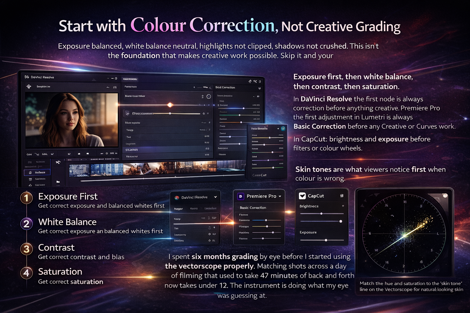 Exposure first, then white balance, then contrast, then saturation. In DaVinci Resolve the first node is always correction before anything creative. In Premiere Pro the first adjustment in Lumetri is always Basic Correction before any Creative or Curves work. In CapCut: brightness and exposure before filters or colour wheels.