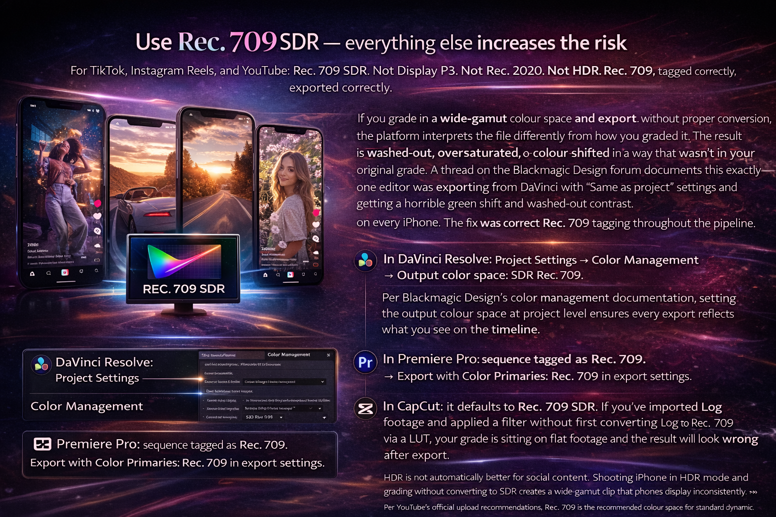What colour space should I use for social media? Rec. 709 SDR for everything — TikTok, Instagram Reels, YouTube Shorts, and long-form YouTube. It's the standard every platform interprets consistently and every phone displays correctly. HDR and wide-gamut colour spaces increase the risk of colour shifts and display inconsistencies across different devices and apps.