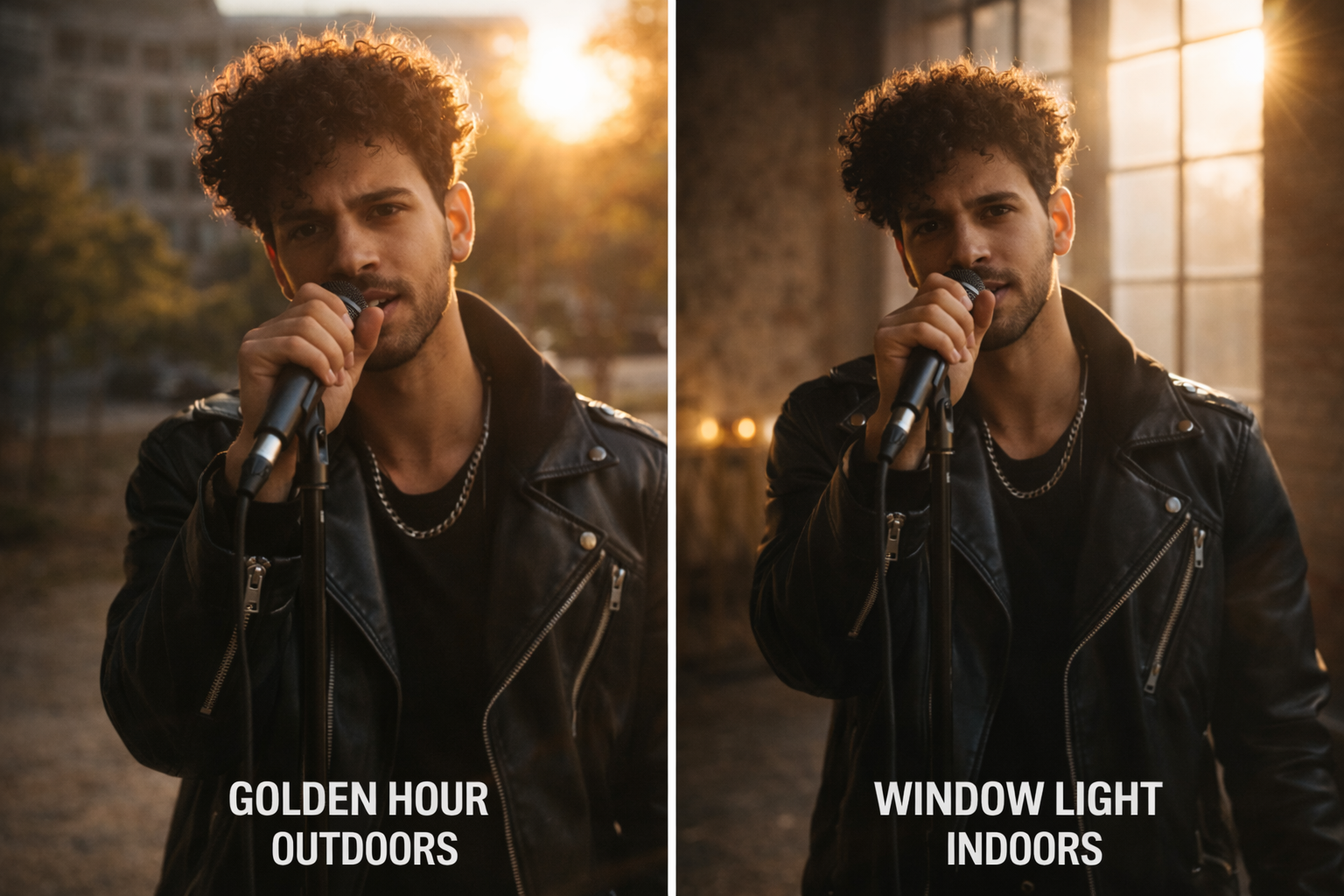 Golden hour is your baseline — the 45 minutes after sunrise and before sunset. The light is directional, warm, and soft enough that you need no modification. I've shot 23 minutes of clean usable music video footage in a single golden hour session with nothing but a tripod and available light. No reflector, no fill, nothing to adjust between takes.