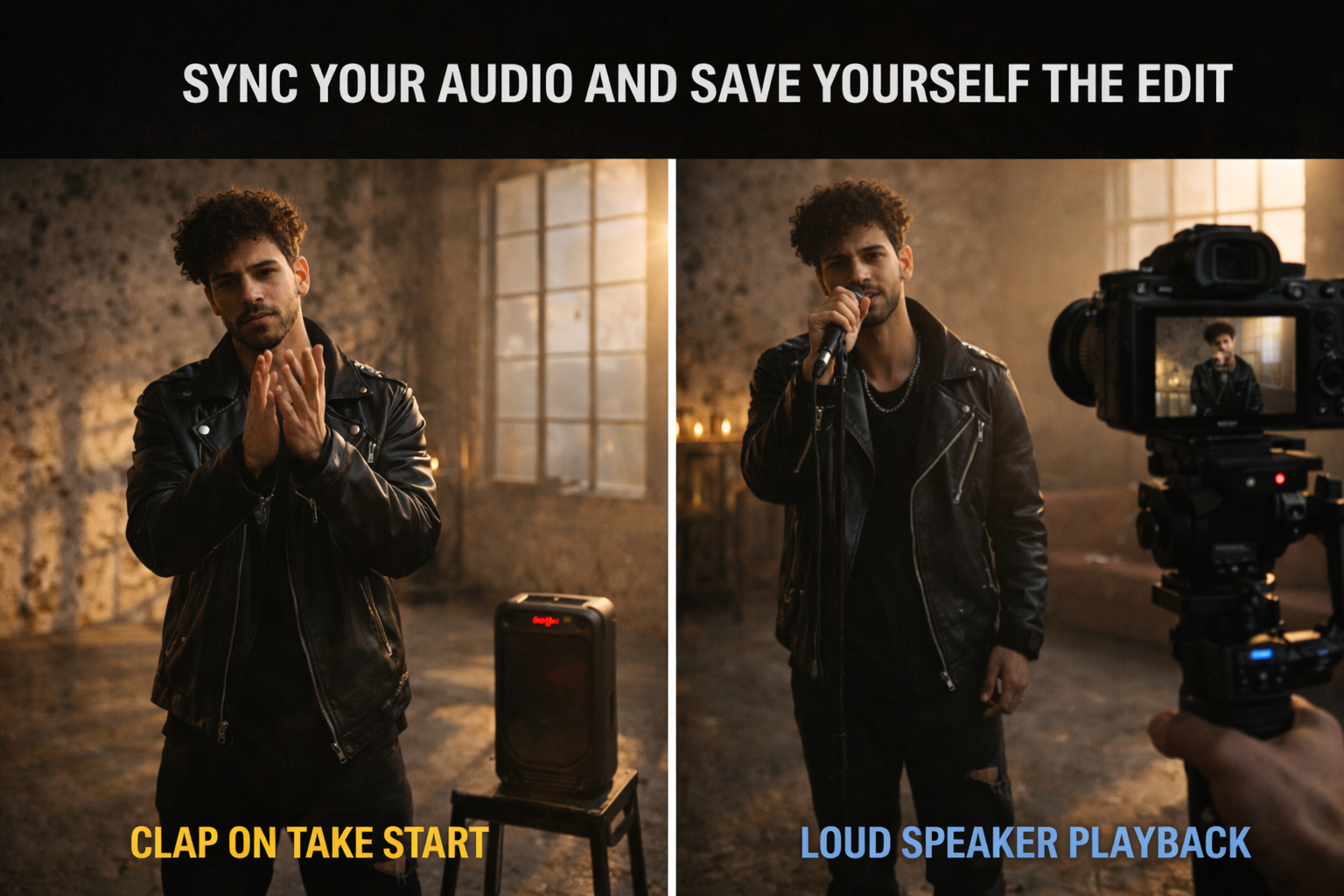 Clap on the first beat at the start of every take — one visible clap in frame right as the intro hits. In the edit this gives you a sync point for every take without a clapperboard or a second person. For the edit itself: sync your best performance take to the master audio, then cut picture to that track, replacing sections with better takes as needed. Every cut is motivated by the music. More detail on the beat-sync editing process in How to Edit a Music Video: Sync Cuts to the Beat →