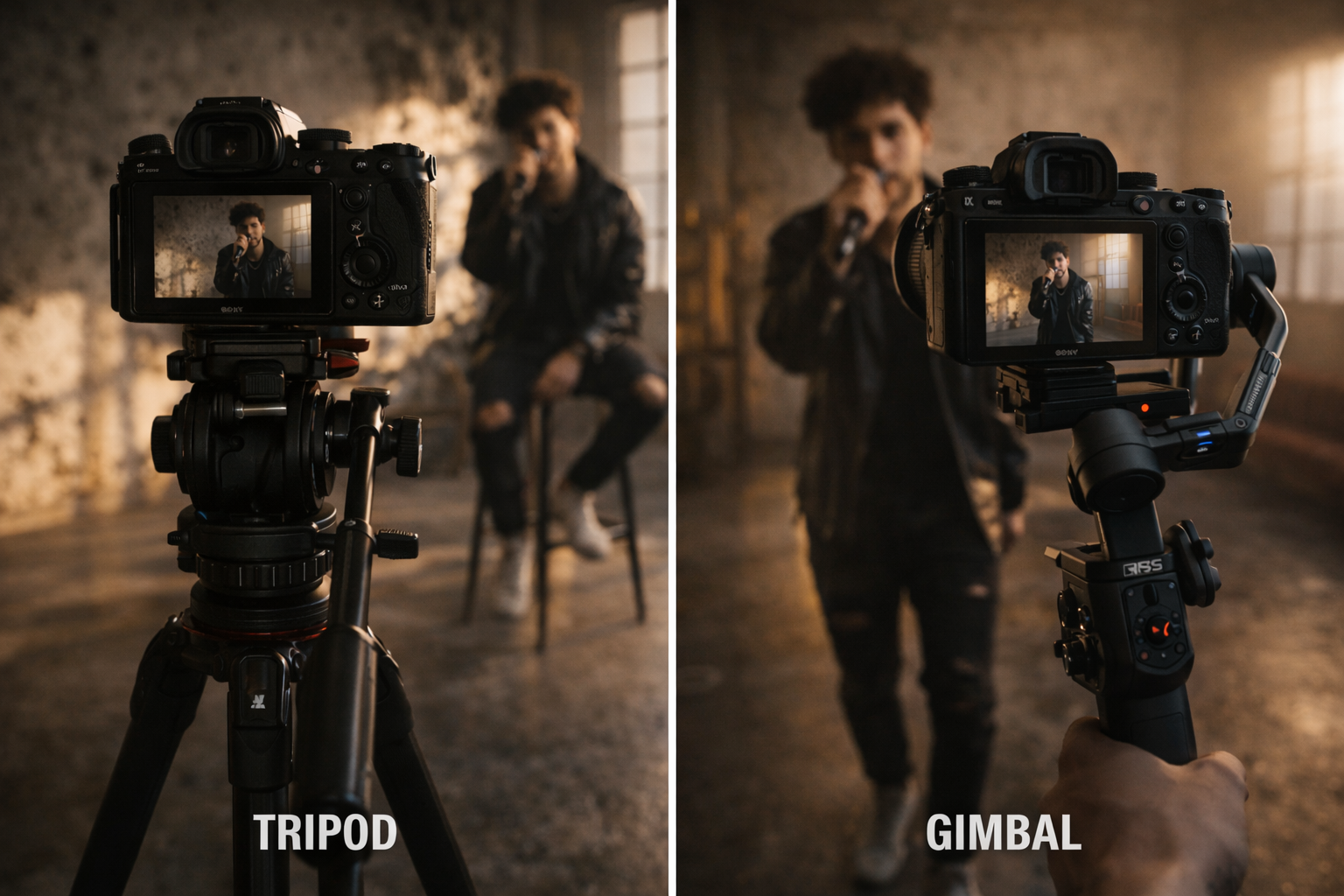 For movement shots — walking through a location, approaching camera, anything with the artist in motion — a gimbal solves the stabilisation problem that would normally require an operator. The DJI RS 4 works with most mirrorless cameras and handles up to 3kg. The workflow: set frame on gimbal, press record via remote, walk to starting position, perform the shot, walk back. For a walking-toward-camera shot it takes about 7 attempts to get walk speed, timing, and performance aligned. Annoying. Also completely doable.