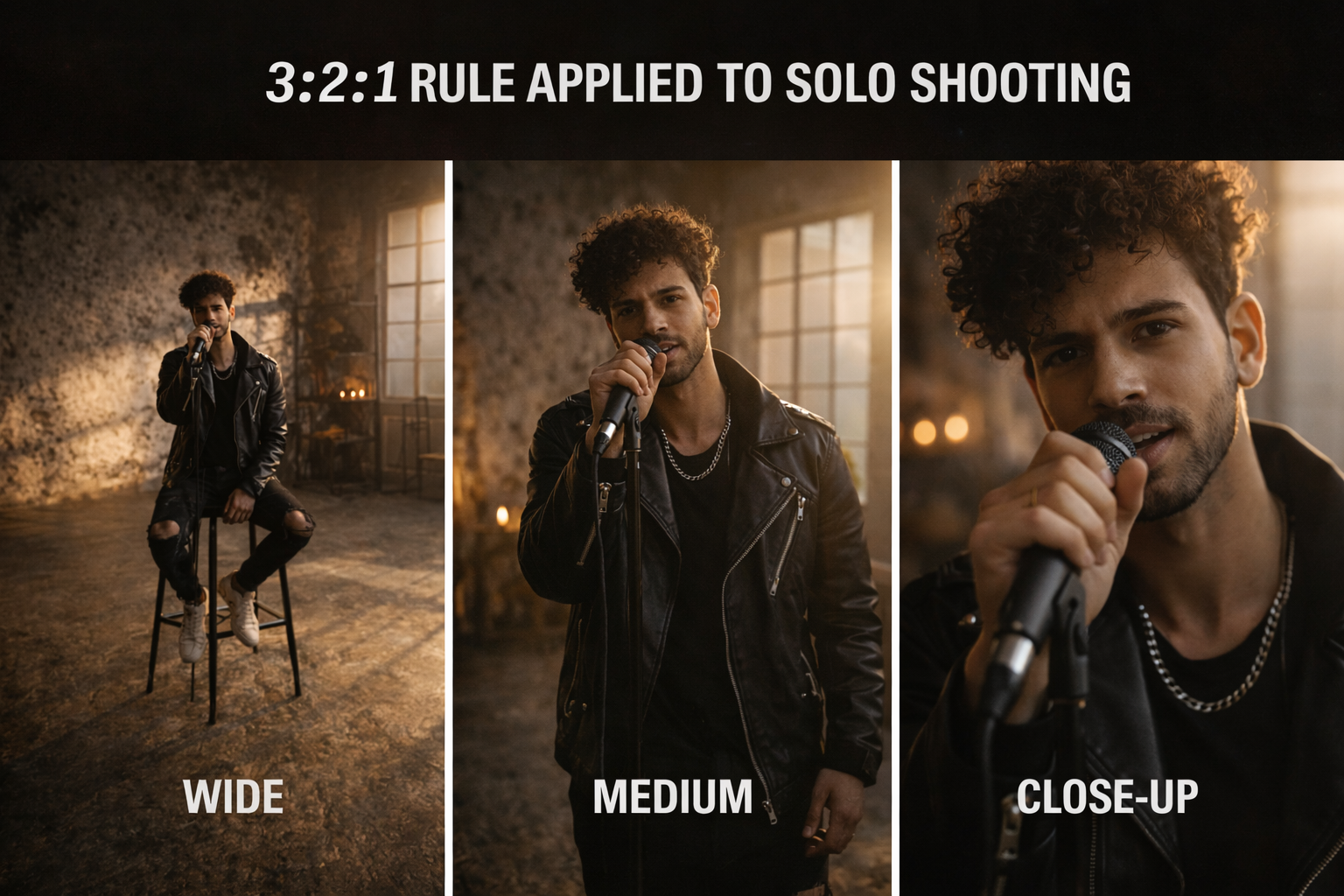 What's the 3:2:1 rule in video editing? For solo shooting it means: 3 framings per scene (wide, medium, close), 2 takes of each, 1 safety take of anything that can't be reshot. More broadly in editing it refers to three shots in sequence before cutting — wide, medium, tight — to establish location, subject, and detail. Both interpretations are useful for solo music video work.
