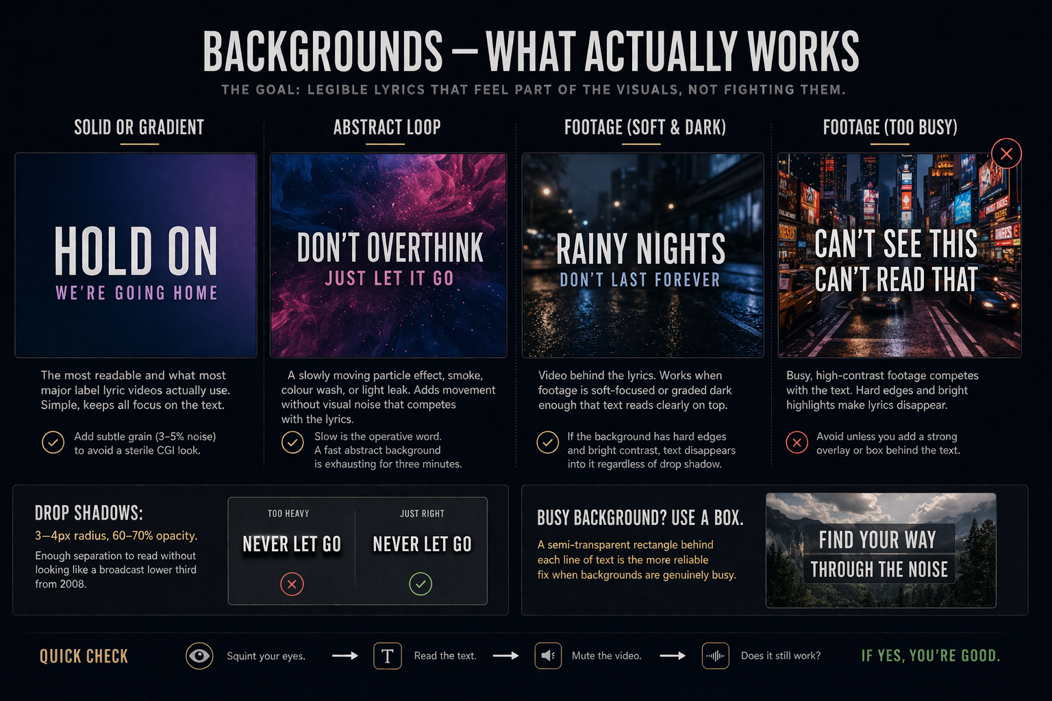 Footage — video behind the lyrics. Works when footage is soft-focused or graded dark enough that text reads clearly on top. If the background has hard edges and bright contrast, text disappears into it regardless of drop shadow.