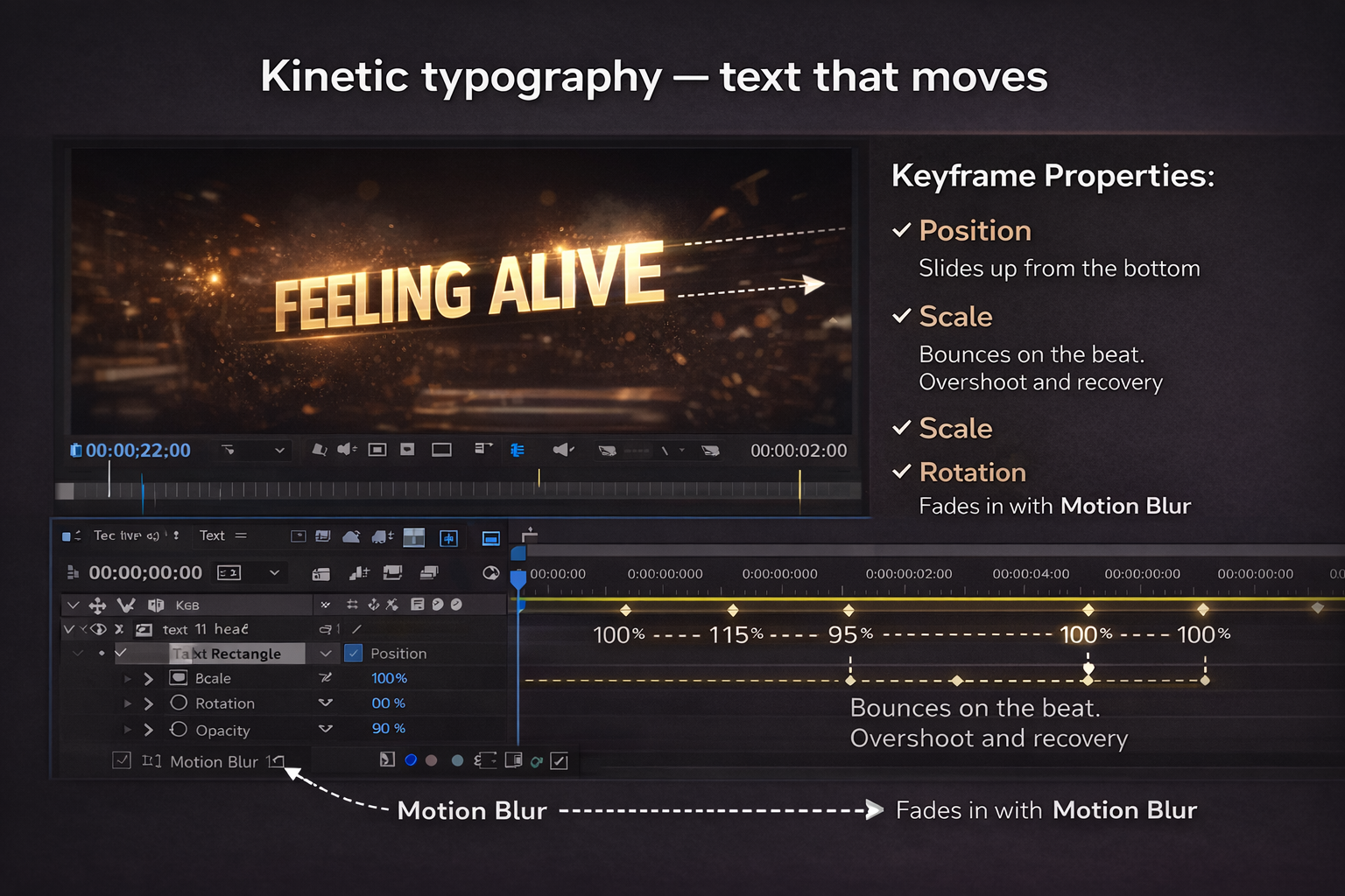 Scale — text size. A word punching up to 120% on a bass hit and settling back to 100% over two frames reads as physical impact. Six keyframes to build, reusable forever after.