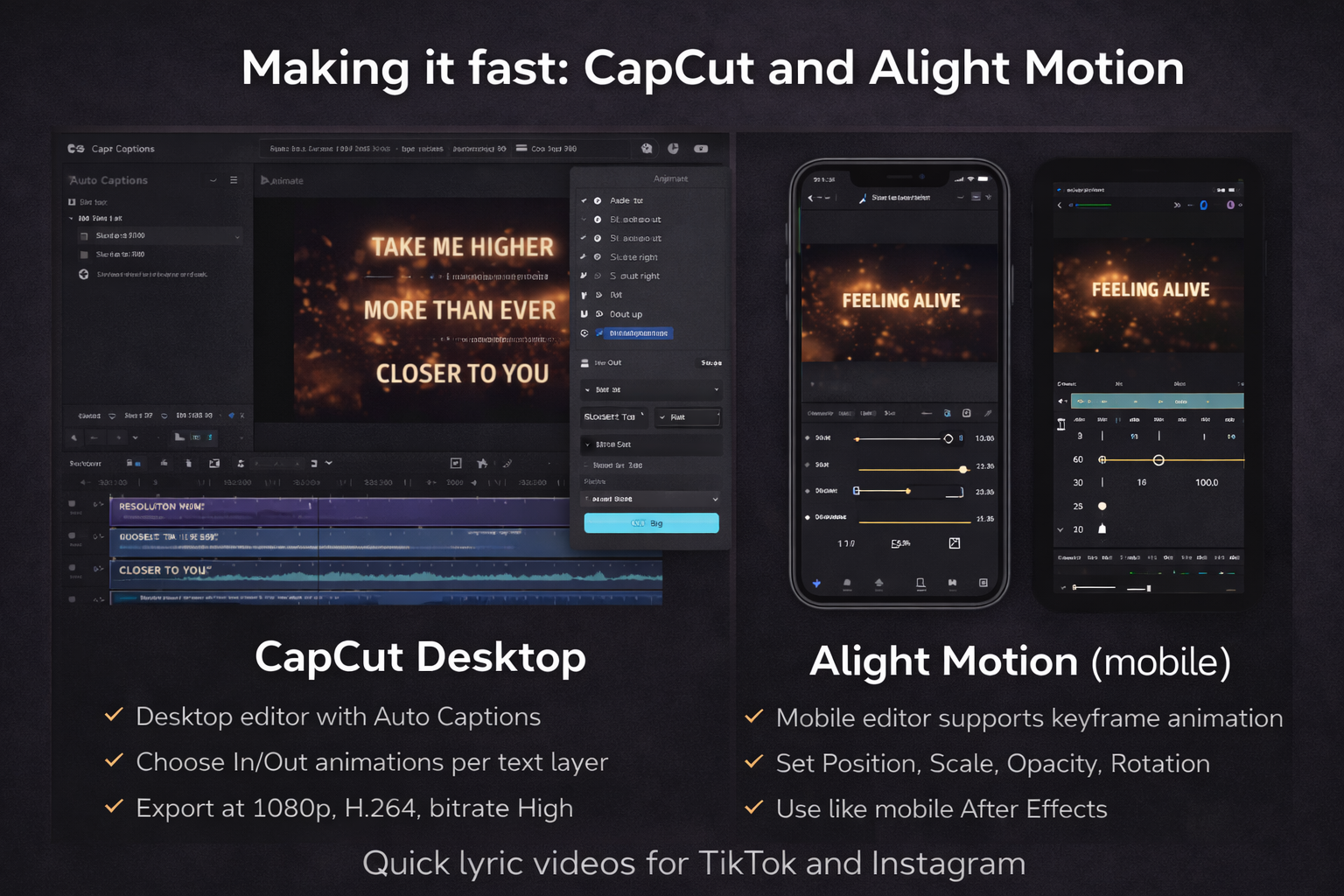 Not every lyric video needs After Effects. For short-form social content — TikTok lyric clips, Instagram Reels, short song previews — CapCut and Alight Motion are faster and the output looks fine.