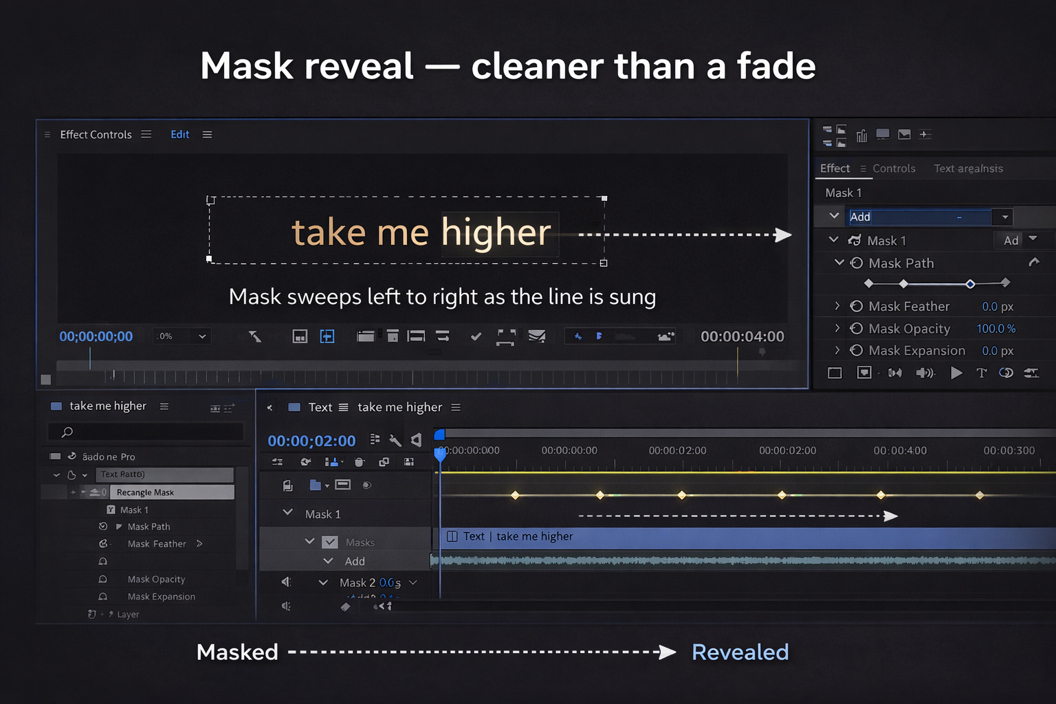 Instead of the whole word appearing at once, a mask sweeps left to right across the text as it's sung. The word materialises as the singer says it. The effect is subtle — the viewer probably can't name what's different — but the difference in how it reads is significant. Text that appears feels placed. Text that reveals feels performed.