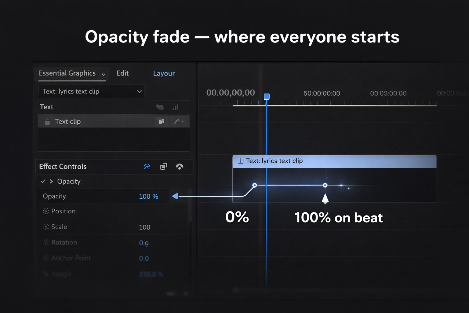 The simplest approach: text fades in on the beat, fades out before the next line. In Premiere Pro or DaVinci Resolve, two opacity keyframes per line — 0% one frame before the beat, 100% on the beat. Add a short ease on the way out.