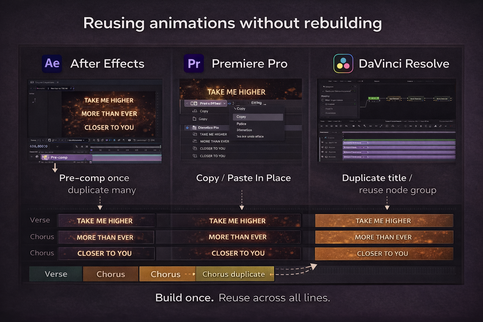 In Premiere Pro: animate your first title, right-click → Copy → Paste In Place for each subsequent line. Adjust clip position on the timeline to match the new timing. Animation keyframes come with it.