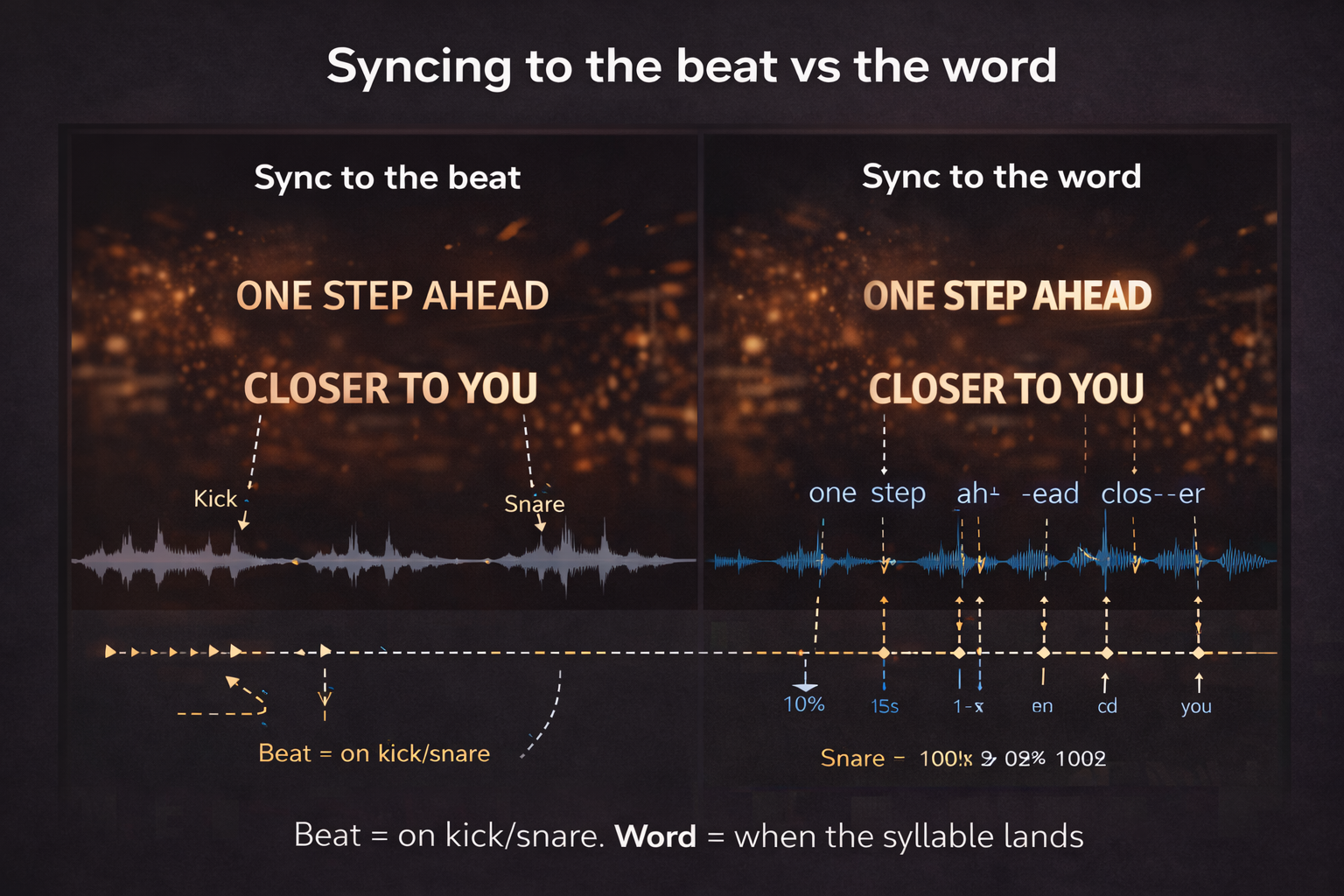 Sync to the beat — text changes on the kick or snare regardless of exactly where the syllable falls. Slightly looser, more musical. Works better for melodic content where the listener's attention is on the groove rather than individual words.
