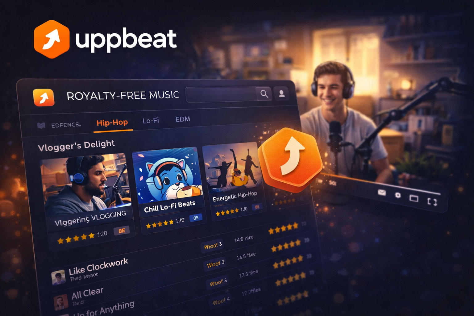 Uppbeat is curated in a way Pixabay isn't. The tracks are selected rather than uploaded by anyone with an account, which means the average quality is noticeably higher. The site is built specifically for video creators — you can filter by platform (YouTube, TikTok, Instagram), by energy level, by whether a track has vocals.